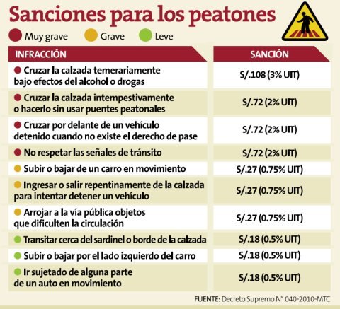 Desde del 2010 la Policía Nacional empezó a aplicar multas para aquellos peatones que no cumplan con las reglas de tránsito. El 50% de los accidentes de tránsito en zonas urbanas la ocasionan las personas que incumplen con las normas viales.