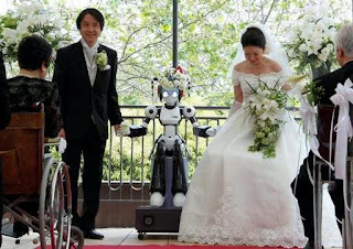 La robot I-Fairy de coletas de plástico y ojos brillantes realizó su primer casamiento en Tokio , Japón. La I-Fairy mide 1,5 metros (cuatro pies) de alto y no puede ponerse de pie, pero sabe hablar muy bien.